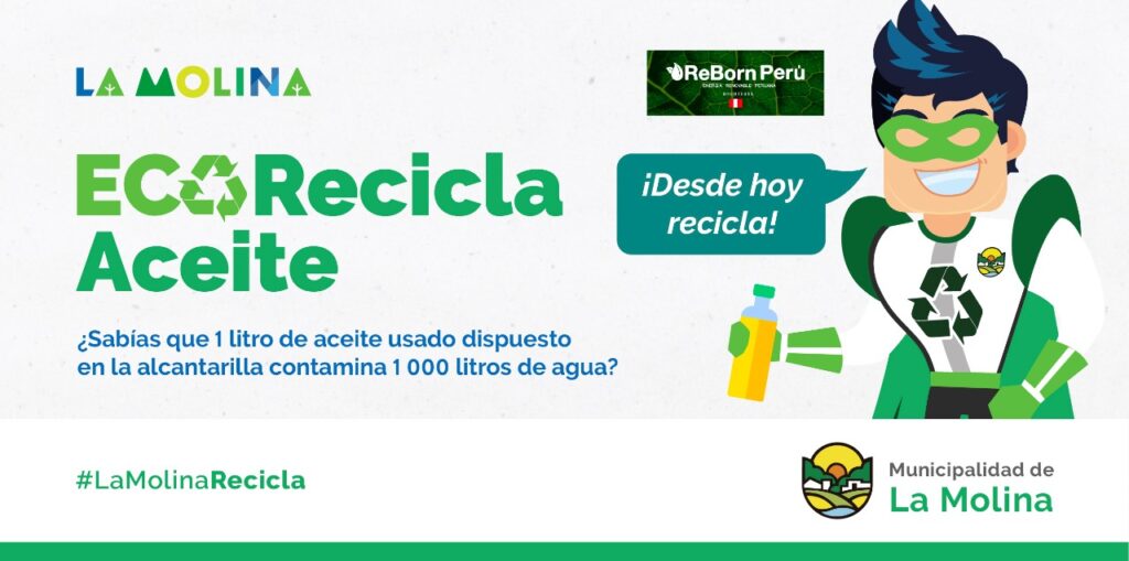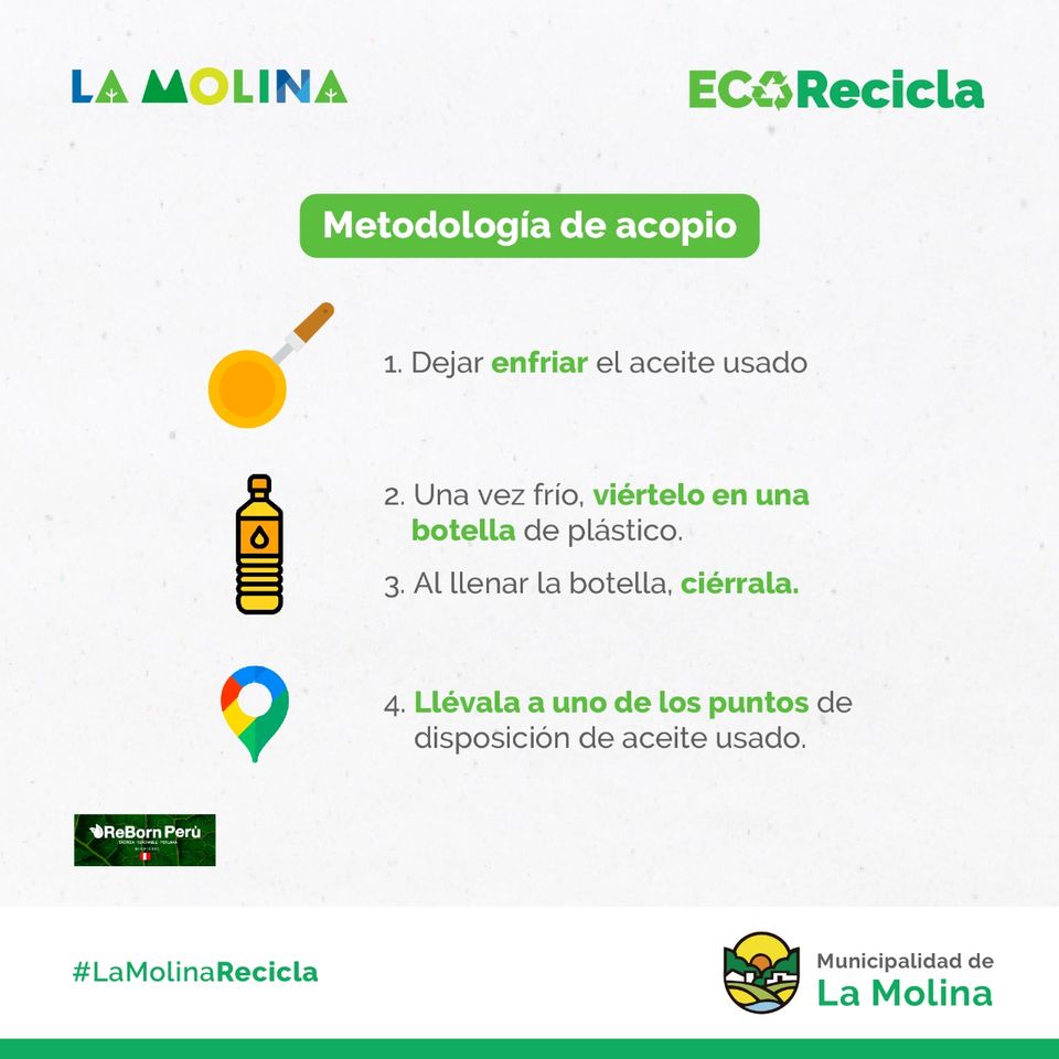 ¿Sabías que 1 litro de aceite usado dispuesto en la alcantarilla contamina 1000 litros de agua? Gracias al convenio con la empresa Reborn Perú S.A.C. este aceite puede ser tratado y convertido en biodiesel para ser utilizado los vehículos que atienden los programa, Fono Árbol, CIAM y otros más. Súmate.