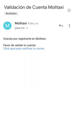 Es importante que el vecino usuario del aplicativo Molitaxi cuente con un correo electrónico habilitado. Después del registro se enviará un correo de confirmación al correo** indicado en el registro.